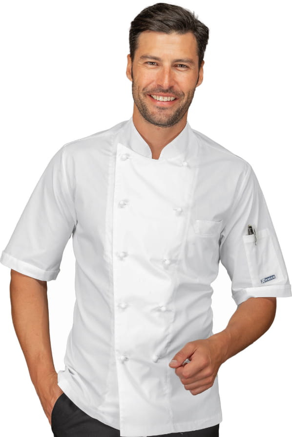 - Elegancki wygląd: Slimowany krój, kieszeń na piersi oraz na rękawie w połączeniu z klasycznym białym kolorem nadają profesjonalny wygląd, który jest idealny do pracy w kuchni.