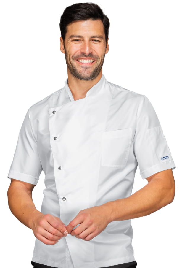 Bluza kucharska unisex szefa kuchni slimowana firmy Isacco model Belfast. Bluza posiada krotkie rękawy, asymetryczne zapięcie na zatrzaski oraz kieszeń na piersi i na rękawie. Tył wykonany w całości z siatki z mikroforu.