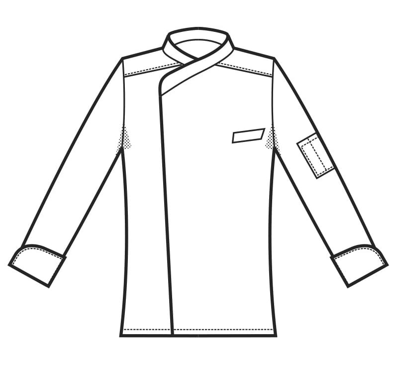 Bluza kucharska unisex szefa kuchni firmy Isacco model Bilbao. Bluza posiada długie rękawy, asymetryczne zapięcie na zatrzaski oraz kieszeń na piersi i na rękawie.