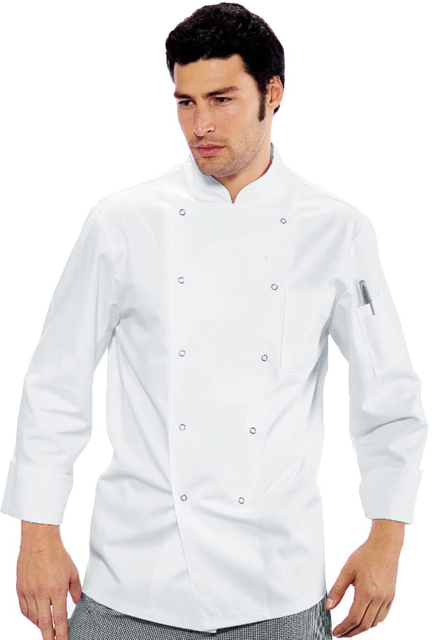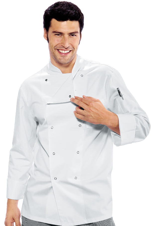 Bluza kucharska unisex szefa kuchni slimowana firmy Isacco model Classic. Bluza posiada długie rękawy, zapięcie na guziki oraz kieszeń na piersi.