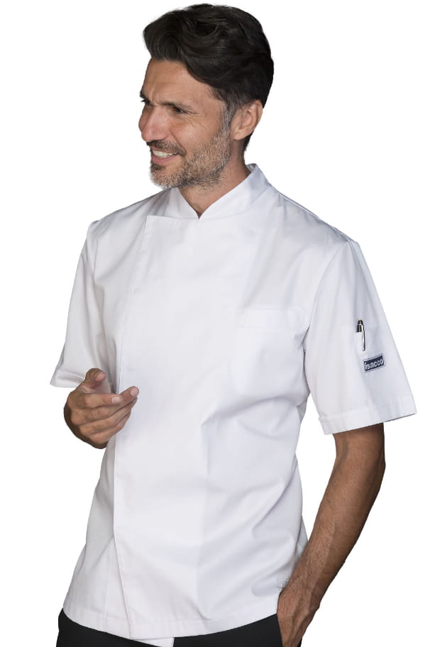 Bluza kucharska slimowana unisex szefa kuchni firmy Isacco model Helsinki. Bluza posiada krótkie rękawy, klasyczne zapięcie na ukryte zatrzaski oraz kieszeń na piersi i na rękawie.