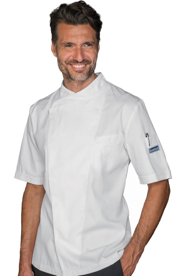Bluza kucharska slimowana unisex szefa kuchni firmy Isacco model Tokyo. Bluza posiada krótkie rękawy, zapięcie na zatrzaski oraz kieszeń na piersi i na rękawie. Tył wykonany w całości z siatki z mikroforu aby poprawić doskonałą oddychalność.