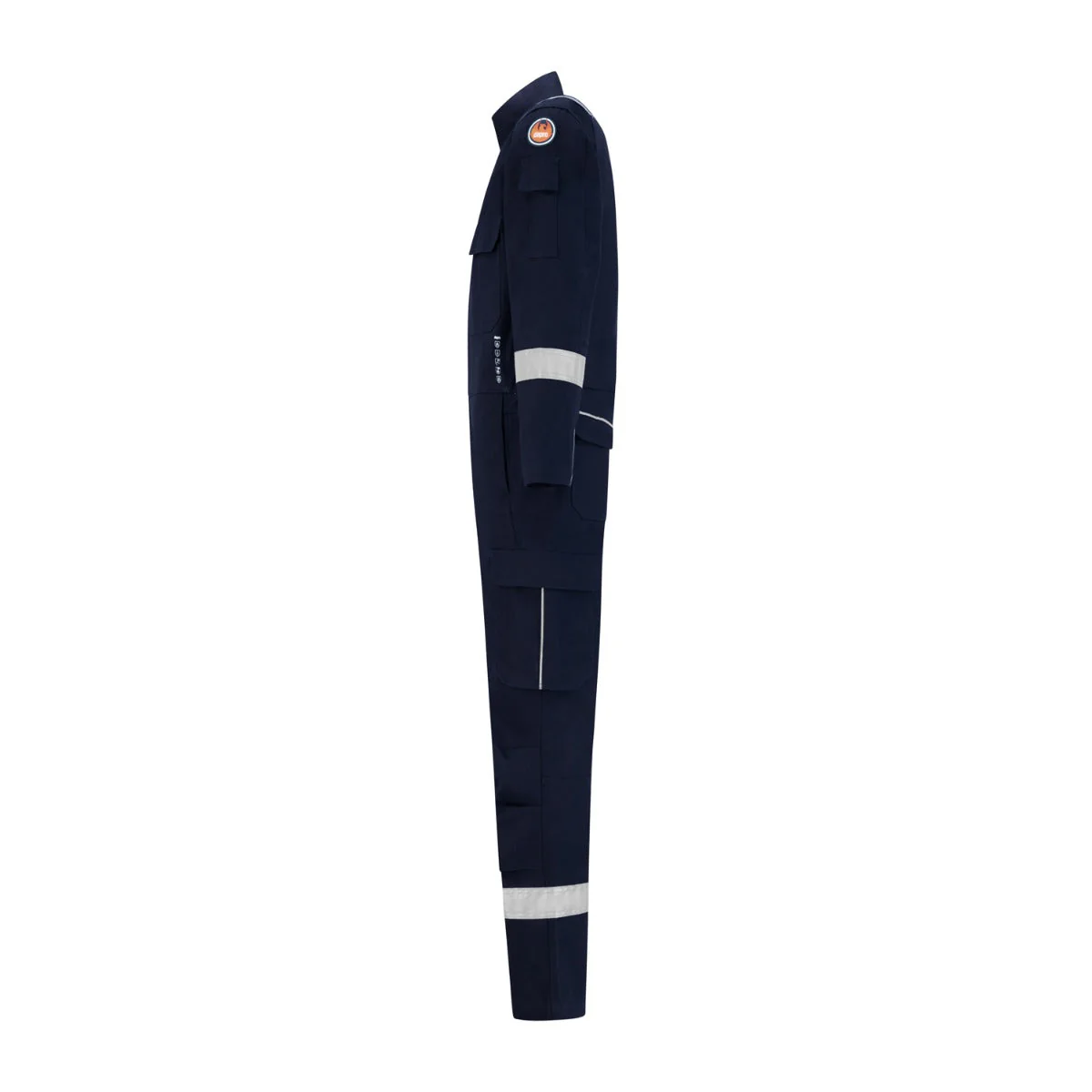 Kombinezon wyposażony jest w liczne rozwiązania zwiększające bezpieczeństwo i funkcjonalność: ergonomicznie profilowane rękawy, wzmocnienia na kolanach, liczne kieszenie z klapami zabezpieczającymi, regulowane mankiety i nogawki, a także pas z elastyczną regulacją dla idealnego dopasowania. Dodatkowym atutem są trudnopalne elementy odblaskowe Prolux® o szerokości 50 mm, które zwiększają widoczność w warunkach ograniczonej widoczności.