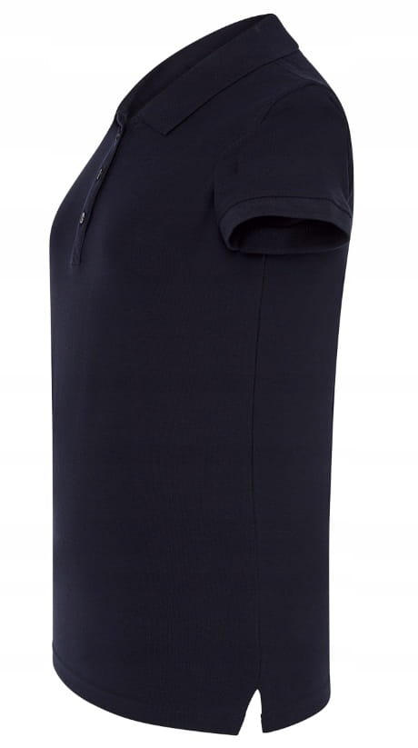 Polówka z krótkim rękawem damska, dopasowana. Zapinana na 3 pasujące guziki. Krawędzie rękawów ze ściągaczem, rozcięcia boczne. Szwy elastyczne sprawiają, że koszulka się ładnie dopasowuje.