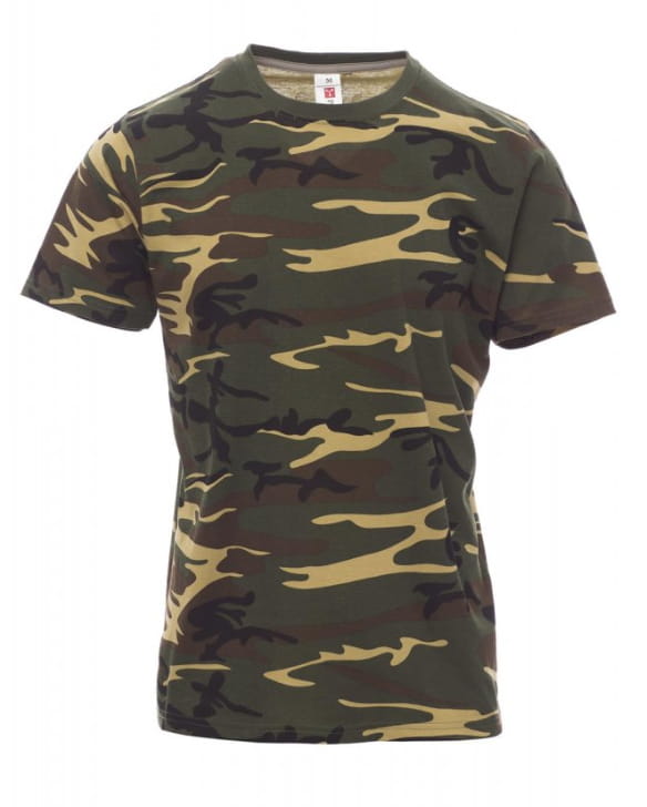 T-shirt z krótkim rękawem męski, dekolt okrągły, z wykończeniem dekoltu w postaci taśmy 1,5 cm ściągacza z dodatkiem spandeksu, obszycie wierzchnie z przodu, kontrastująca taśma wzmacniająca na całej szerokości barków, widoczna na spodniej części kołnierzyka, szwy elastyczne, wzór typu tuba (wersja maskująca ze szwami bocznymi).