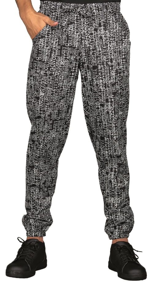 Spodnie kucharskie joggery unisex firmy Isacco model San Francisko ze sznurowadłami i elastycznymi nogawkami.