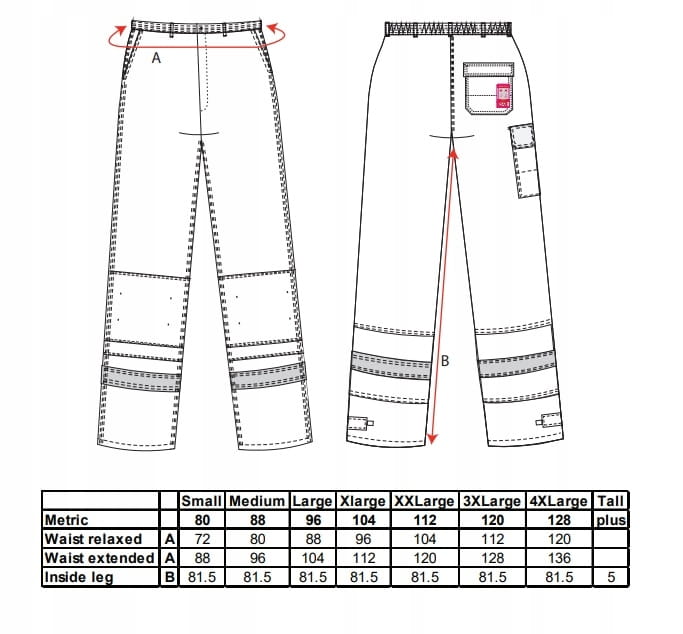 Spodnie taśmą odblaskową przyszytą podwójnym ściegiem i podwyższającą widoczność pracownika. Zapinane na mosiężny zamek błyskawiczny. Posiadają kieszenie na nakolanniki i na linijkę. Potrójne szwy. Na końcach nogawek zastosowano regulację.